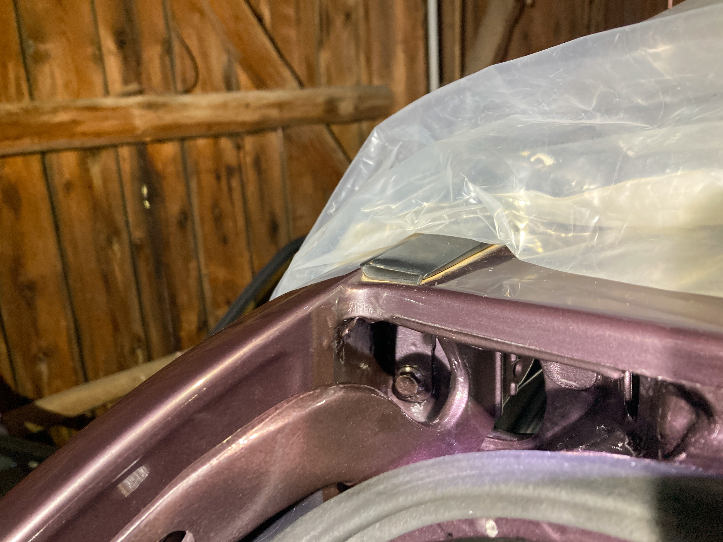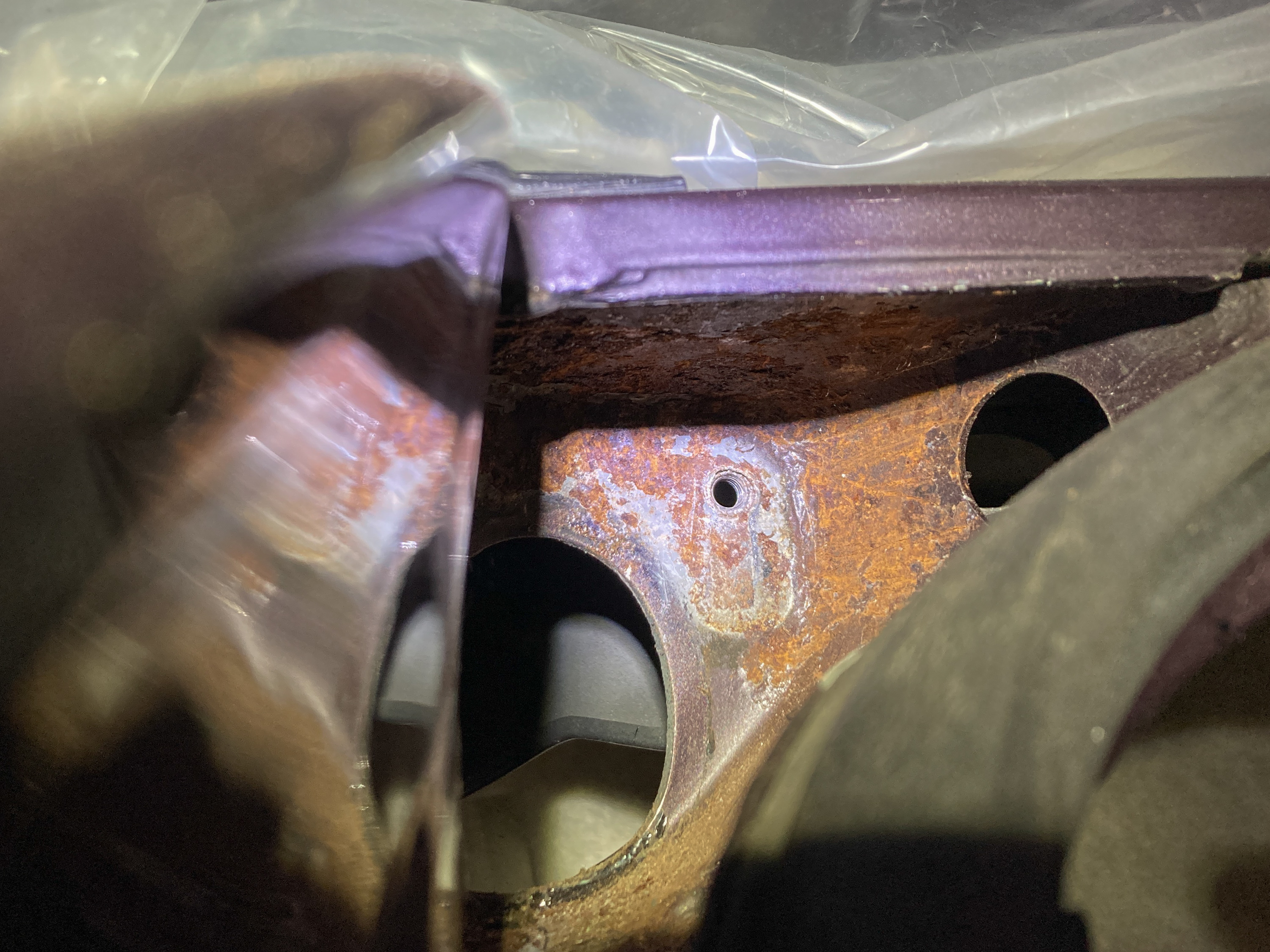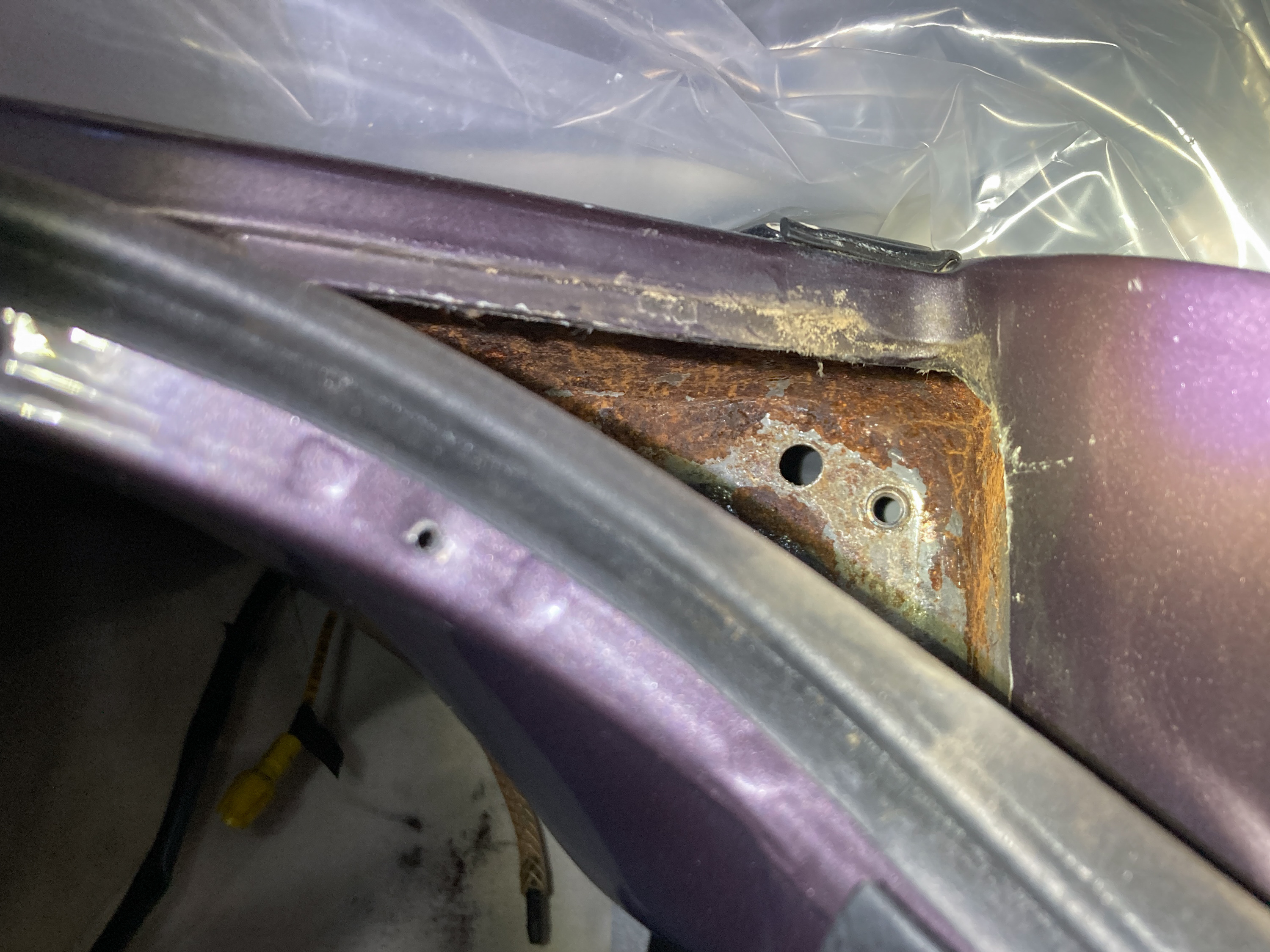 Nachdem der Schacht leer ist, zeigt sich das ganze Ausmaß: Quelle des Rosts sind die Kontaktflächen zwischen Scharnier und Karosserie. Hier ist die Grundierung im Tauchbad gar nicht überall hingezogen, so dass stellenweise blankes Blech zu sehen ist. Früher oder später schafft es Feuchtigkeit dazwischen und hat dann leichtes Spiel.