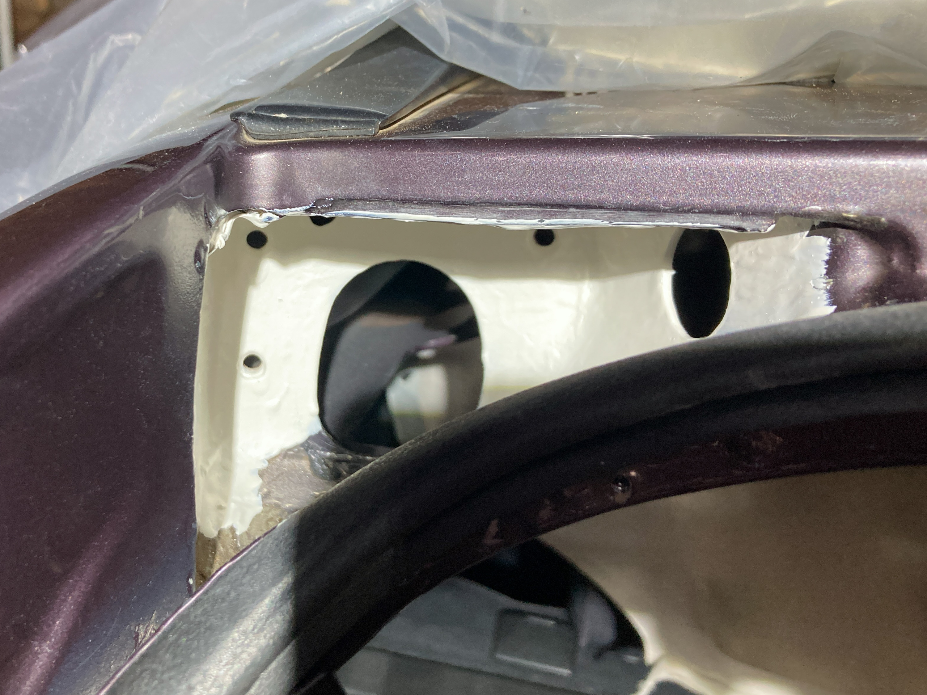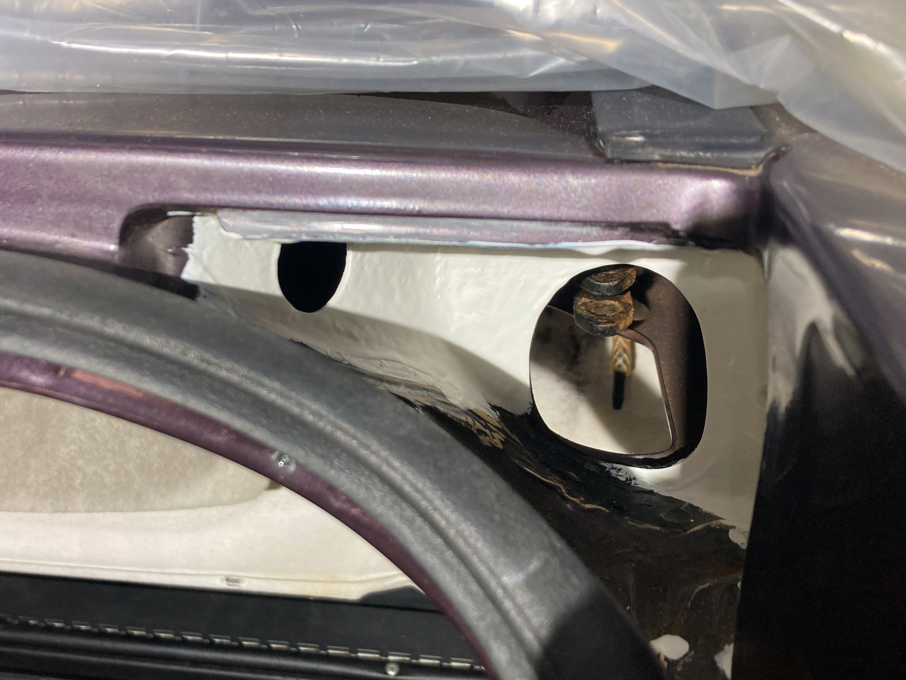 Bei eingebauter Heckklappe ist praktisch gar nichts zu sehen. Wer ganz genau schaut, erkennt eventuell ein paar Bläschen zwischen der Kabeldurchführung und dem Scharnier aber mehr nicht. Nach dem Ausbau der Heckklappe mitsamt Kabeldurchführungen kommt dann die erste Erkenntnis: Oh, das sieht aber gar nicht so gut aus.